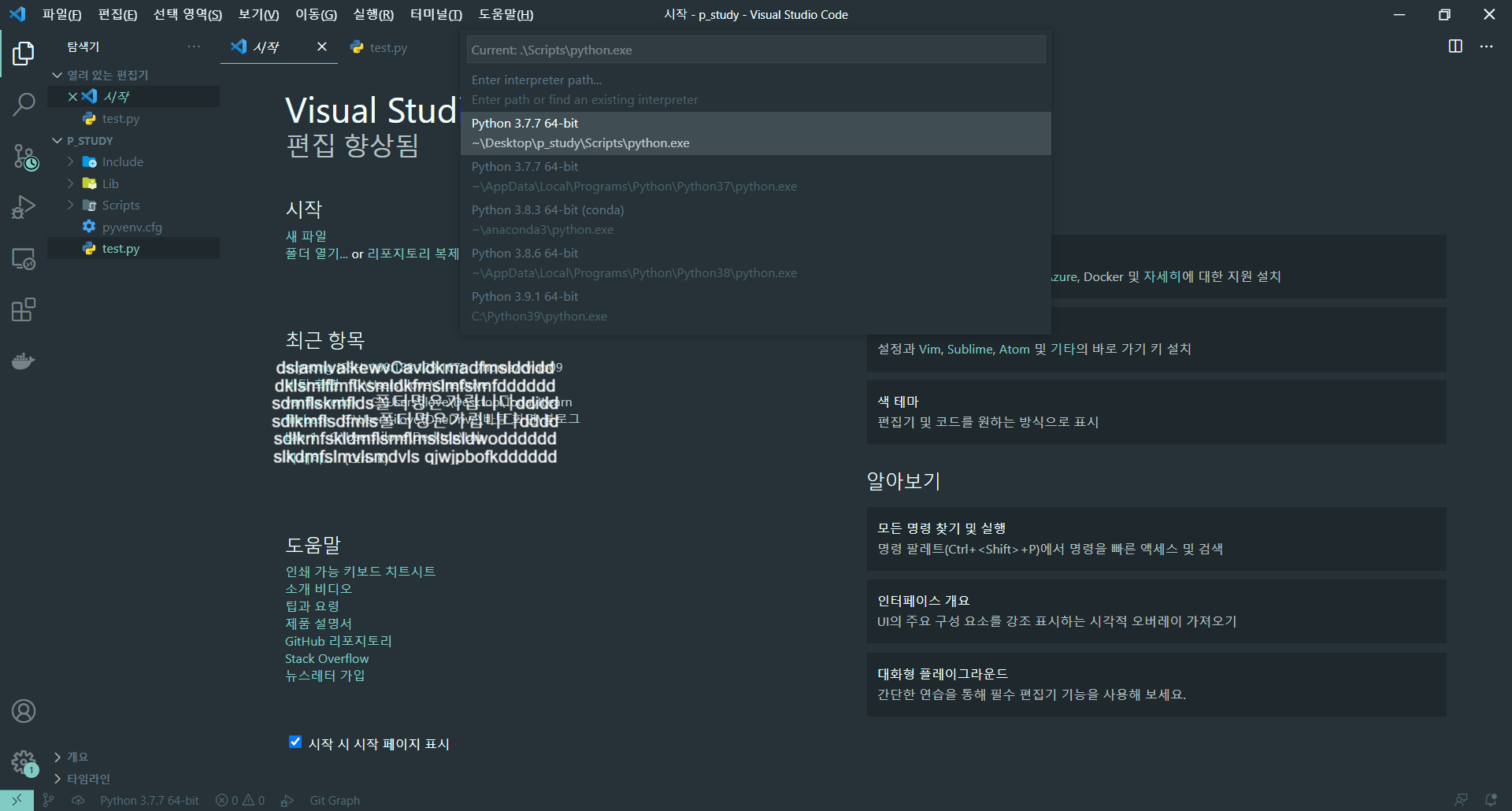 python select interpreter> 디렉토리\Scripts\python.exe를 선택